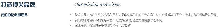 2012年公司斥巨資從德國專業(yè)空氣研發(fā)實驗室引進銳鈦型納米二氧化鈦研發(fā)成果,同時與國內知名高校進行合作,成立“光之吻”品牌,致力于為人類創(chuàng)作純凈,健康的呼吸環(huán)境,成為你身邊的健康衛(wèi)士,實現365天健康呼吸的夢想,目前是同類產品中最有競爭力的品牌之一。